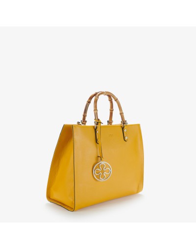 Shopping a mano in Pelle, con manico in Bambu. Arricchita dal ciondolo metallico che riproduce l’iconico fiorone V73. Sul corpo borsa il logo è marchiato a fuoco.