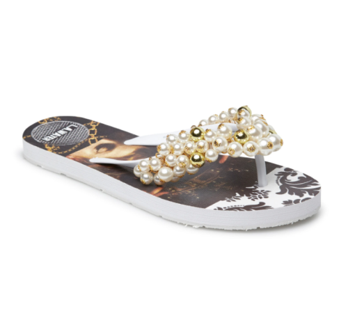Ciabattina con pattern ispirato all’arte barocca sui toni del bianco, nero e oro. Tomaia di perle bianche.